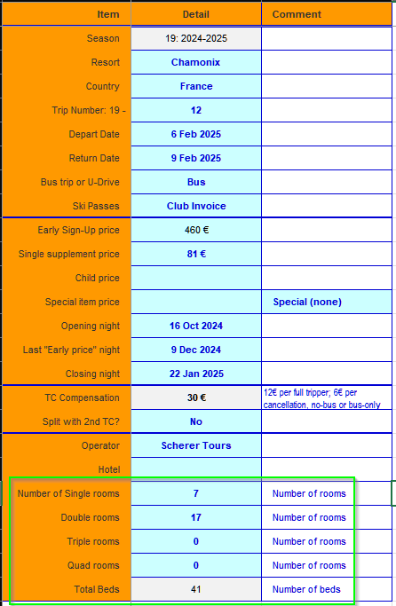 Additionally, the "Trip Data" sheet also lists key dates, including the last "Early Price" night. After this date, the price increases by €25. This is the deadline by which we must confirm if we have enough members (usually more than 20) to keep the bus trip.