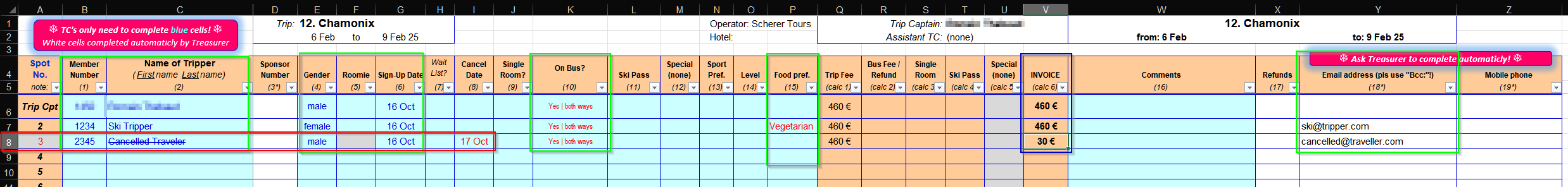 A sign-up is complete once a value appears in the INVOICE column, which is highlighted in blue. At this point, the tripper is officially booked for the trip and their details are fully entered into the system.